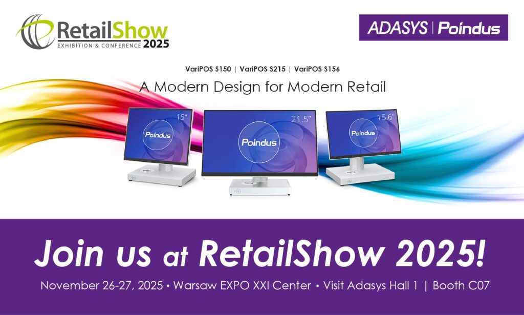 Join the ADASYS Team at RetailShow 2025. We’re showcasing modern POS solutions from Poindus, peripherals and AI solutions + strong setups with POSPOLE (pole/mounting solutions) and APG (Cash Drawer & Cash Management).